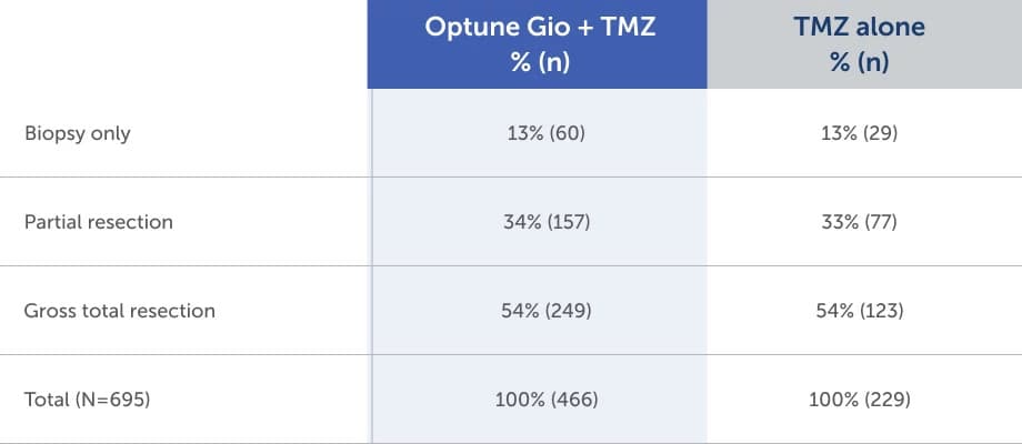 Optune Gio + TMZ improved median survival vs TMZ alone regardless of extent of resection