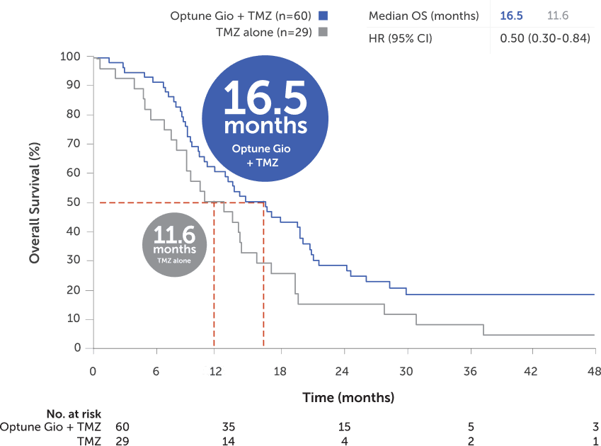 Biopsy-only patients using Optune Gio + TMZ had longer median OS (16.5 months) vs those using TMZ alone (11.6 months)1