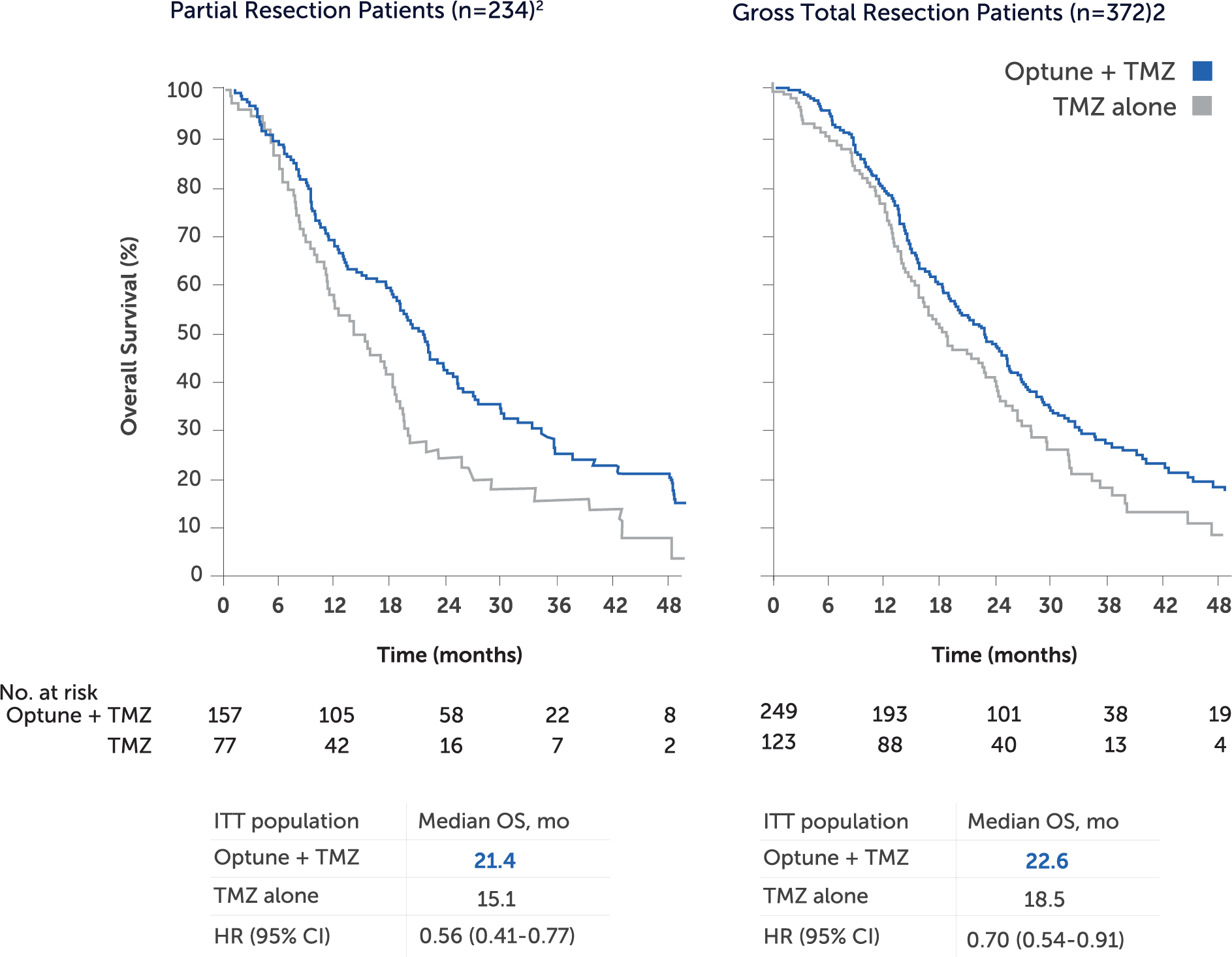 - In patients who had a gross total resection, median OS was 22.6 months with Optune Gio + TMZ (n=249) compared with 18.5 months with TMZ alone (n=123) (HR: 0.70 [95% CI, 0.54-0.91])1,2