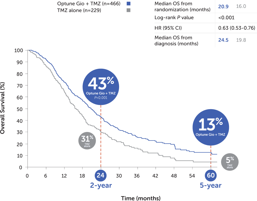 Survival with Optune Gio + TMZ vs TMZ alone was significantly higher at the 2-year landmark analysis and remained higher at 5 years1,2