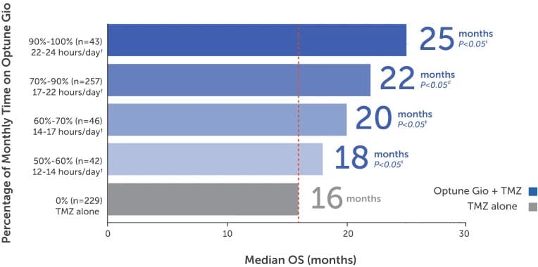 References: 1. Optune Gio. Instructions For Use. Novocure; 2023. 2. Stupp R, Taillibert S, Kanner A, et al. Effect of tumor-treating fields plus maintenance temozolomide vs maintenance temozolomide alone on survival in patients with glioblastoma: a randomized clinical trial. JAMA. 2017;318(23):2306-2316. 3. Stupp R, Idbaih A, Steinberg DM, et al. Prospective, multi-center phase III trial of tumor treating fields together with temozolomide compared to temozolomide alone in newly diagnosed glioblastoma. Presented at: 2017 Annual Meeting of the American Association for Cancer Research; April 1-5, 2017; Washington, DC. Oral presentation LBA AACR CT007. 4. Referenced with permission from the NCCN Clinical Practice Guidelines in Oncology (NCCN Guidelines®) for Central Nervous System Cancers. V.1.2023. © National Comprehensive Cancer Network, Inc. All rights reserved. Accessed October 6, 2023. To view the most recent and complete version of the NCCN Guidelines, go online to NCCN.org. 5. Toms SA, Kim CY, Nicholas G, Ram Z. Increased compliance with tumor treating fields therapy is prognostic for improved survival in the treatment of glioblastoma: a subgroup analysis of the EF-14 phase III trial. J Neurooncol. 2019;141(2):467-473.
