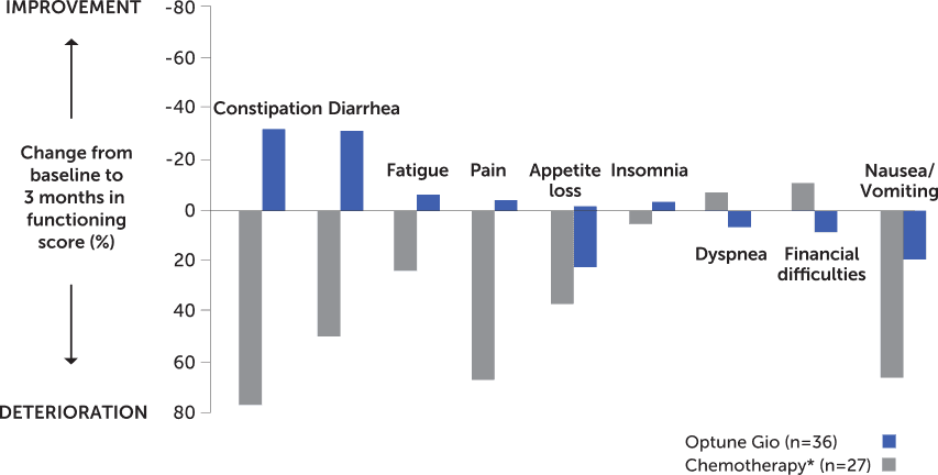 Optune Gio™ monotherapy demonstrated efficacy comparable to that of chemotherapy1,*