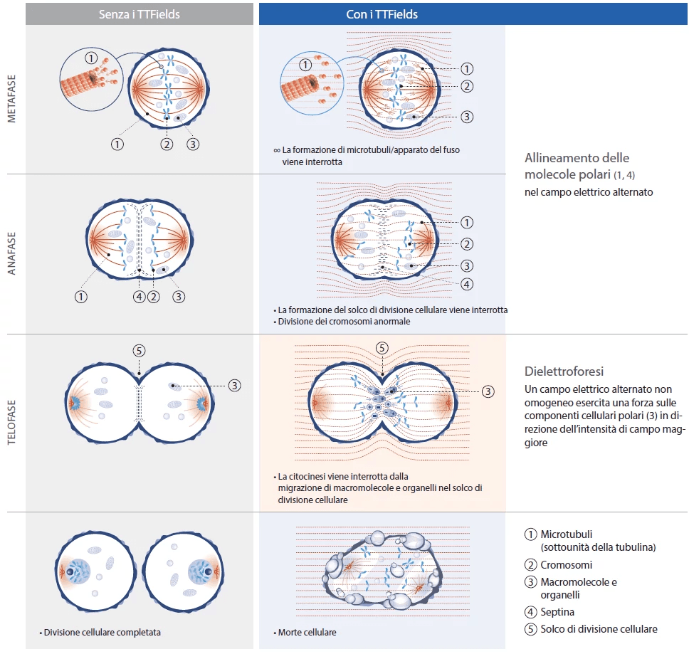 Durante la divisione cellulare, le forze elettriche all’interno della cellula tumorale svolgono un ruolo decisivo nella formazione di determinate strutture, che possono essere influenzate dai campi elettrici. I TTFields sono campi elettrici alternati ad una frequenza che varia tra I 100 e 300 kHz che possono disturbare l’orientamento e la localizzazione di molecole altamente polari, come la tubulina e la septina, e di organelli elettricamente carichi. I TTFields interferiscono con diversi processi importanti per la mitosi e possono portare all’arresto della proliferazione e alla morte cellulare delle cellule tumorali.3-6 La terapia con TTFields contrasta le cellule tumorali in rapida divisione, risparmiando le cellule sane: l’esperienza clinica mostra che gli eventi avversi più comuni sono principalmente reazioni cutanee da lievi a moderate.1,7