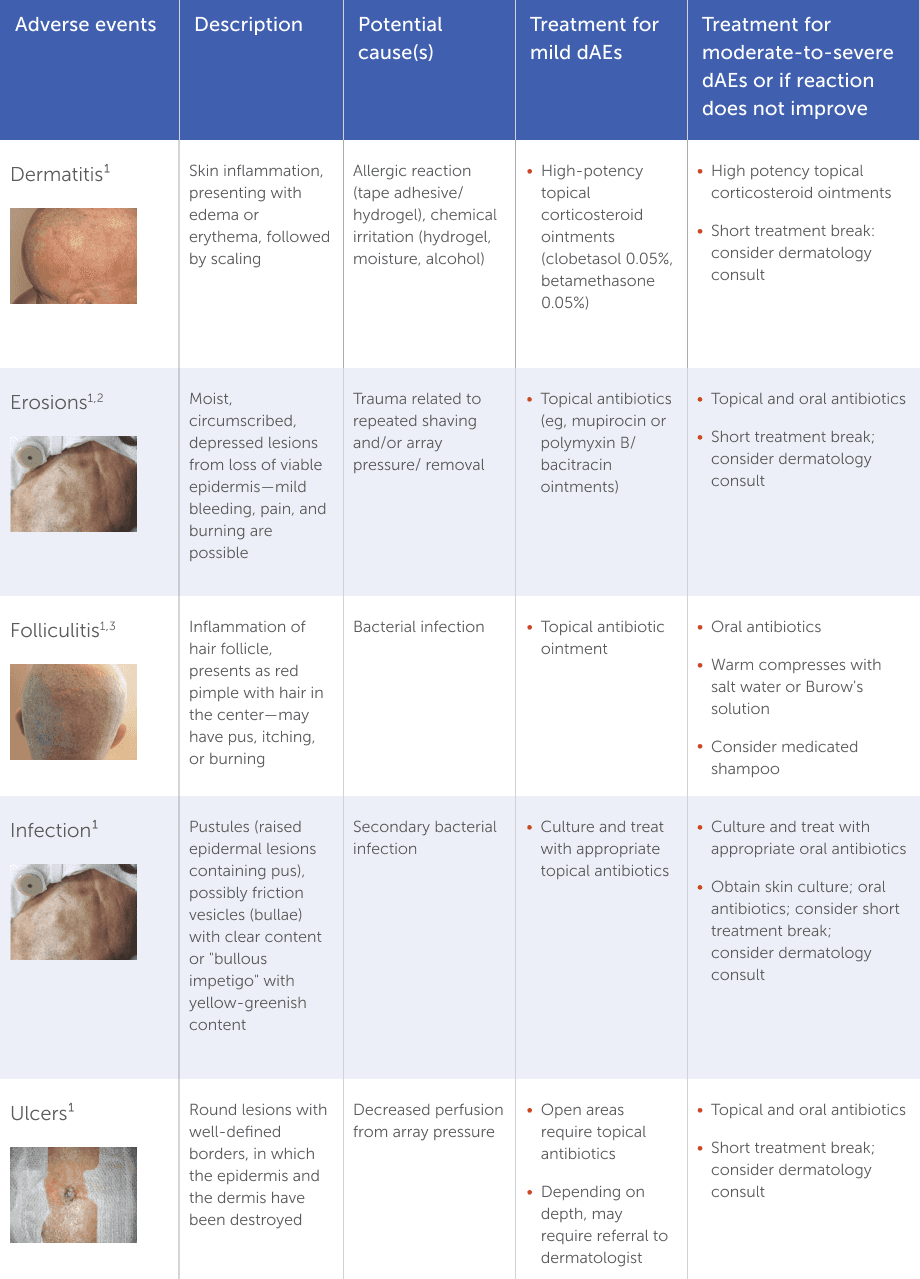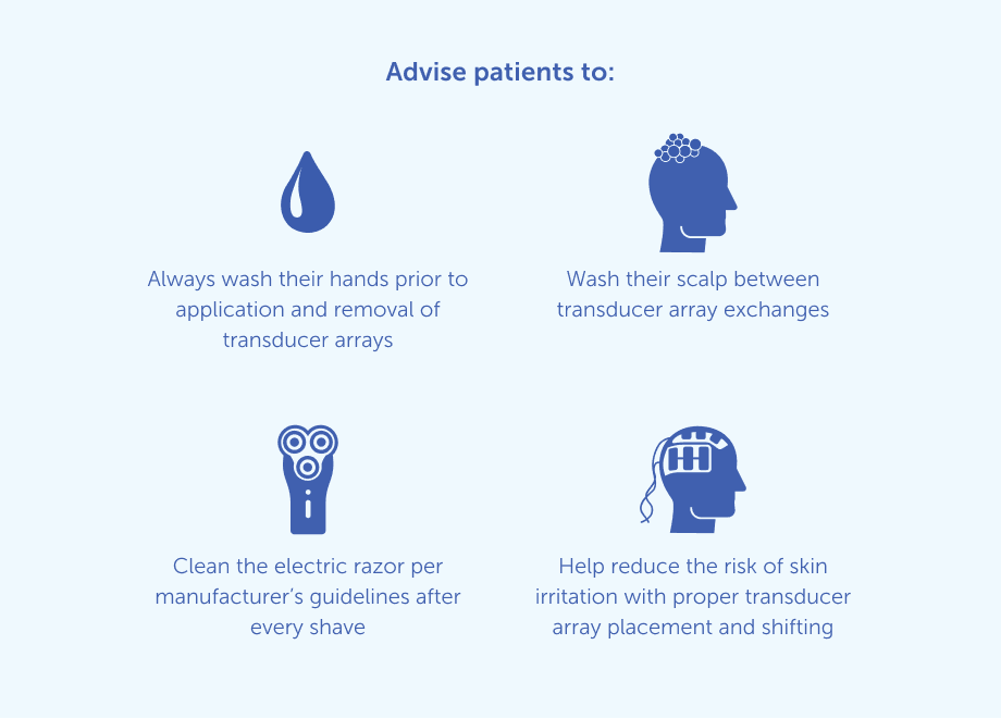 FAQsReferences: 1. Lacouture ME, Davis ME, Elzinga G, et al. Characterization and management of dermatologic adverse events with the NovoTTF-100A System, a novel anti-mitotic electric field device for the treatment of recurrent glioblastoma. Semin Oncol. 2014;41(3 suppl 4):S1-14. 2. Lacouture ME, Anadkat MJ, Ballo MT, et al. Prevention and management of dermatologic adverse events associated with Tumor Treating Fields in patients with glioblastoma. Front Oncol. 2020;10:1045. doi: 10.3389/fonc.2020.01045
