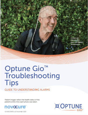 A guide for patients and caregivers to refer to when the Optune Gio device alarm goes off to easily determine and address the cause.