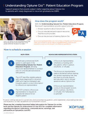 Learn how you can participate in the Understanding Optune Gio: Patient Education Program to get the support you need through educational sessions with a Novocure representative.