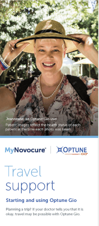 Answers frequently asked questions about travel and provides checklists of what to pack and bring when traveling with Optune Gio.